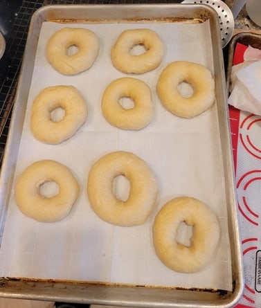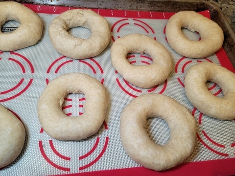 Cover the bagels with a damp paper towel or kitchen cloth and allow the bagels to rest for 30 min