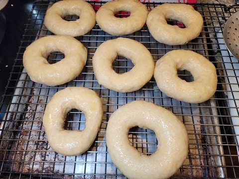 Remove the bagels from the boiling water and place on a cooling rack.